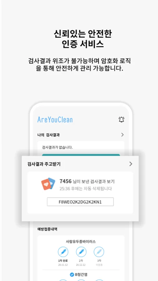 - '종단간 암호화' 기술을 통해 병원의 담당전문의 및 본인이 아니면 그 누구도 절대로 검사결과를 확인할 수 없습니다.