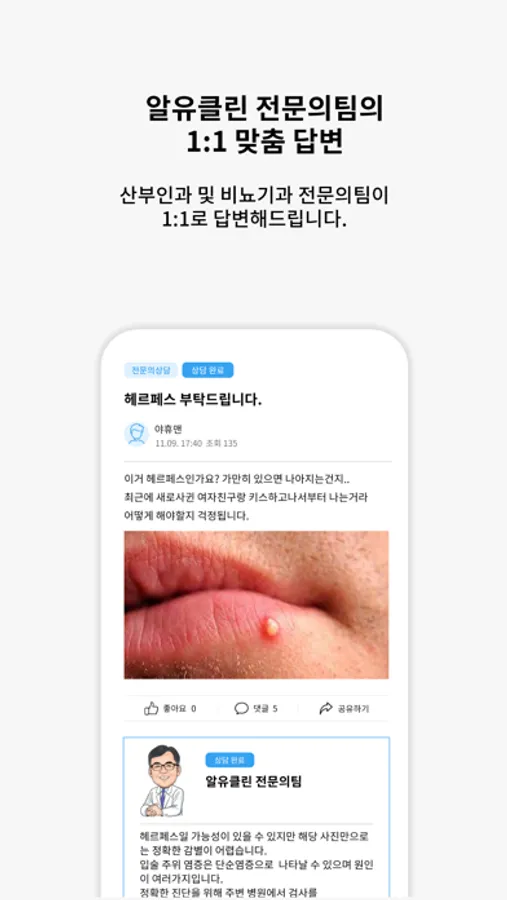 - 같은 증상을 가진 사용자들과 치료, 후기들을 공유하세요.