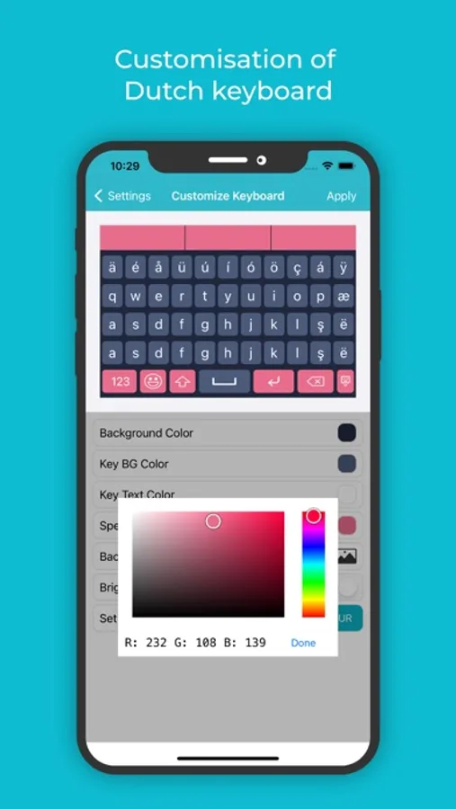 • Change colours for the Background colour, Key background colour, Keyboard text colour, Suggestion box colour etc, so that typing does not seem boring and monotonous with this Dutch keyboard for iOS.