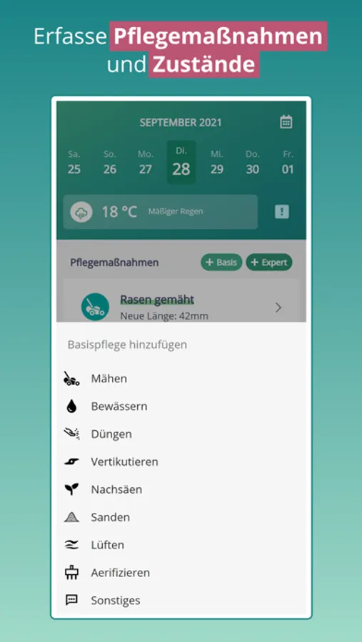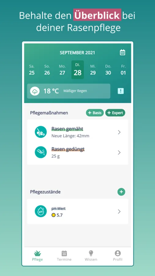 Über einen übersichtlichen Kalender können alle Pflegetätigkeiten eingegeben und genauer spezifiziert werden. Sollte etwas vergessen werden, so wirst du über die App daran erinnert, die auch Wetterereignisse in Betracht zieht und die Termine entsprechend anpasst.
