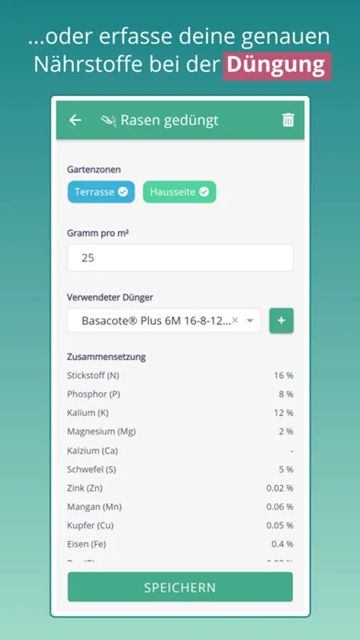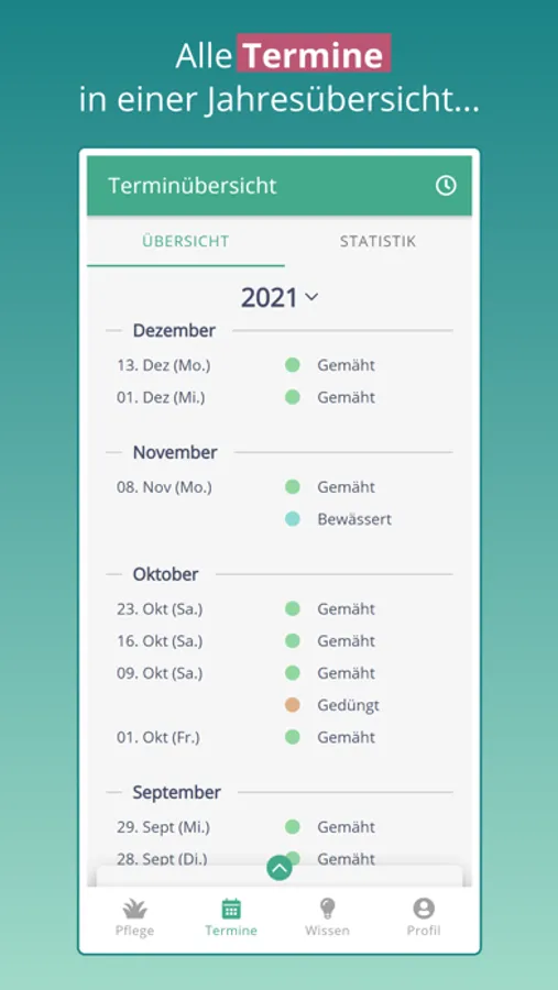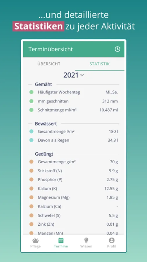 Eine Terminübersicht und Statistik zeigt dir eine Übersicht deiner Jahresaktivitäten und wie oft du welche Pflegemaßnahme vorgenommen hast. Fortgeschrittene werden über die genau ausgebrachte Menge von Stickstoff, Phosphor, Kalium und der wichtigsten Spurenelemente informiert.