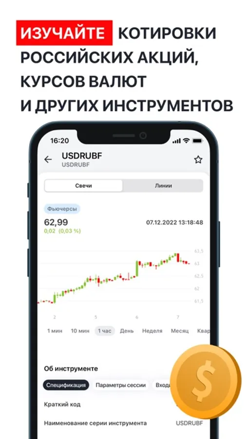 В приложении есть раздел с котировками финансовых инструментов, которые торгуются на Московской бирже.