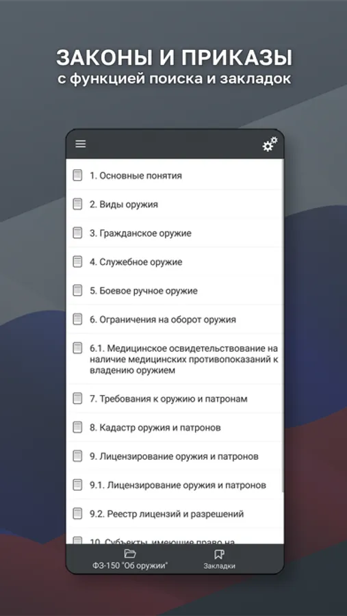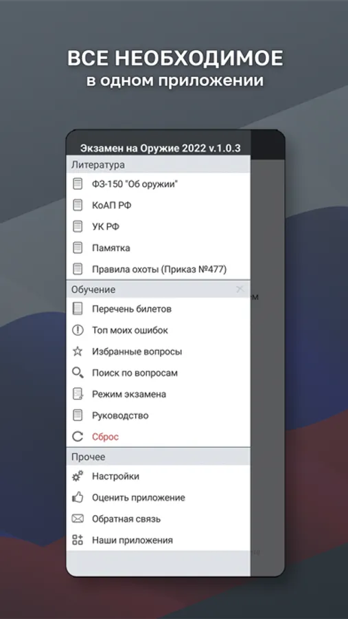 - Содержит перечень оснований для лишения лицензии на оружие, а также тексты действующих нормативных правовых актов в области обращения с огнестрельным оружием и охоты с удобной разбивкой по темам (ФЗ-150 "Об оружии", статьи из УК РФ, статьи из КоАП РФ, Приказ 477 и т.д.)