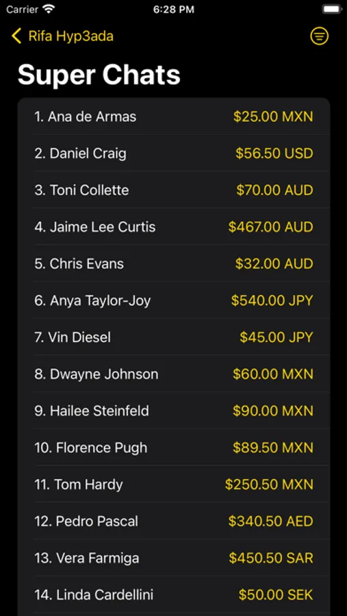 La Rifa Hyp3ada te permite seleccionar aleatoriamente usuarios dentro de una lista. Lo único que tienes que hacer es tener a la mano un archivo CSV (comma separated values) con dos columnas: una llamada Nombre y la otra Cantidad. Los valores de la columna Nombre van a ser los nombres de los usuarios a participar, la columna Cantidad va a contener la divisa y el monto total del Super Chat.
