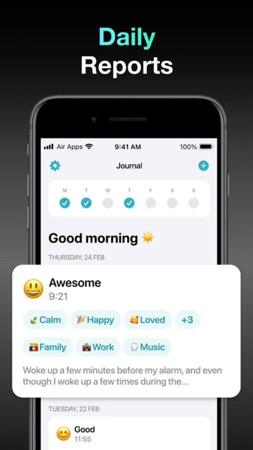 Journal Air is a diary that helps you to reach mindfulness and self-improvement by sharing your thoughts. Create daily reports, relieve stress, reduce anxiety and depression Your mental health and self-care should always be the highest priority.