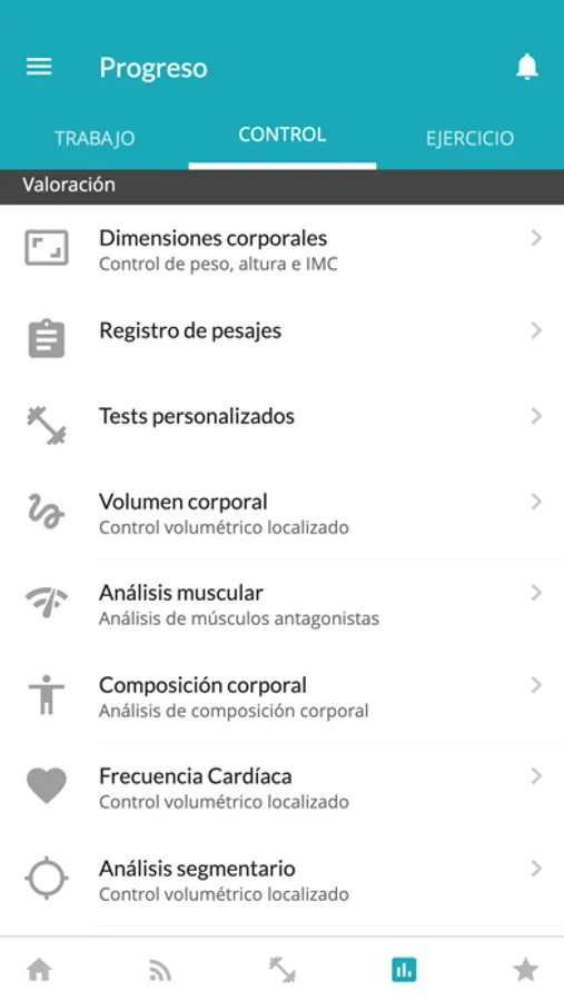- Control médico: Análisis muscular, control de dimensiones y volumen corporal, composición corporal, presión arterial, frecuencia cardíaca, análisis segmentario de grasa y músculo.