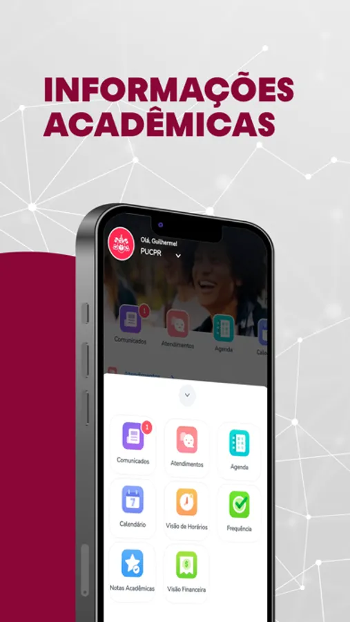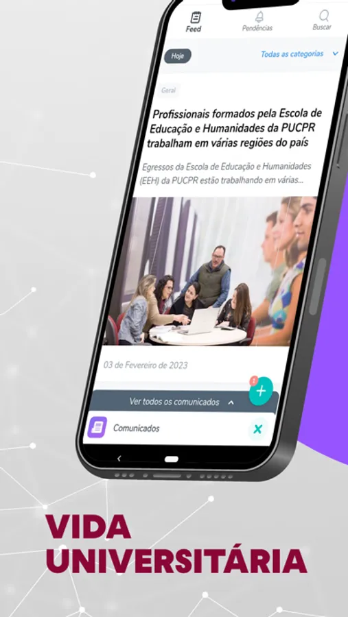 Receba as últimas informações sobre o que acontece na Universidade, acompanhe comunicados, seja notificado sobre eventos e acompanhe sua jornada acadêmica na graduação de maneira simples e rápida.