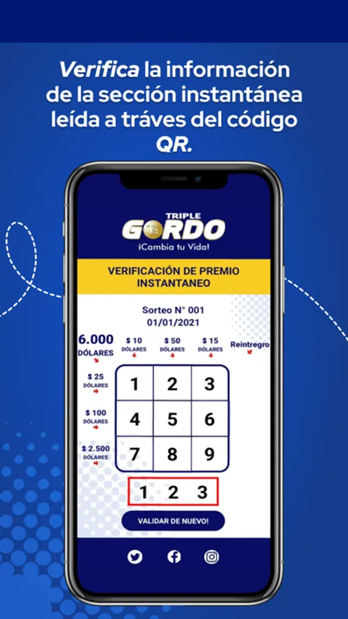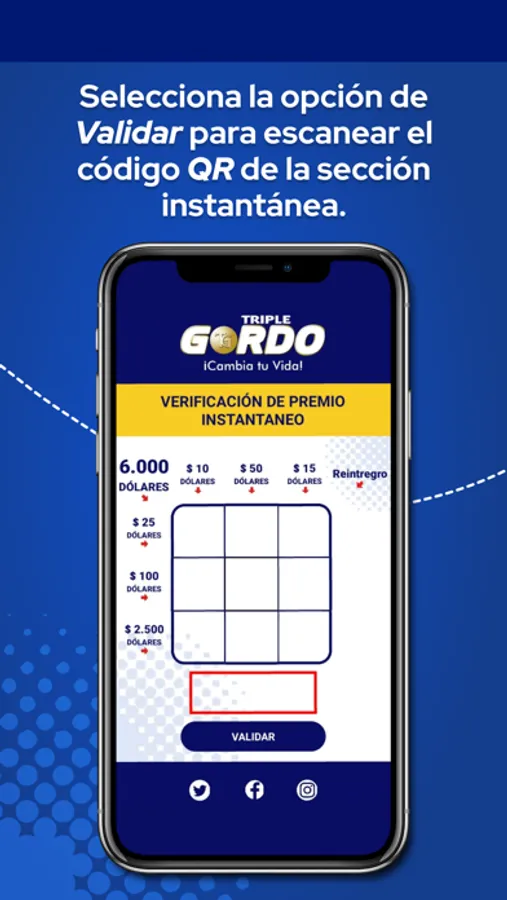 Con la App de Verificación de Triple Gordo, puedes escanear a través de la cámara de tu Iphone, el código QR de la sección instantánea para confirmar la información contenida en tu ticket.