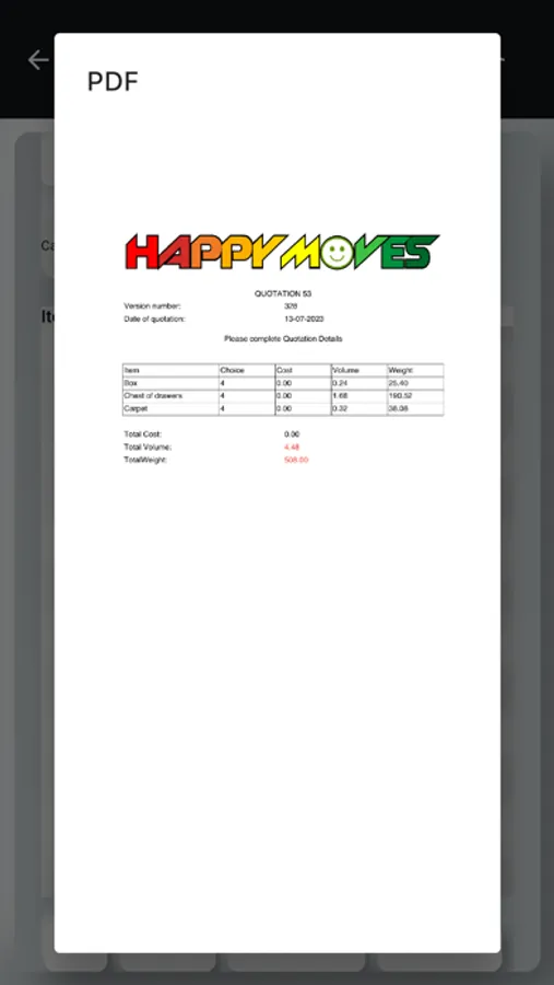 The Happy Moves app automates and manages the process of producing quotation for furniture removal companies. The manager of a removals company can produce a 'template' which contains all information oaf the factors and the algorithm to be used by the company's representatives when visiting a client's premises. By simply completing in-app forms, a representative can produce all documentation needed by client and operatives, for the job to be undertaken in a cost-effective and competitive way.
