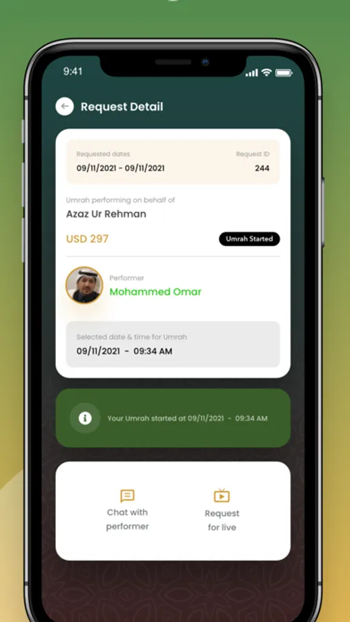 The application is a digital platform aimed at realizing the desire of many Muslim men and women around the world who have not had the opportunity to perform the Umrah themselves for disability, illness, poverty or to perform Umrah on behalf of other deceased parents or relatives, and this platform serves as a reliable digital medium from Mecca in the Land of the Two Holy Mosques. It connects service users and Umrah performers, who have been carefully selected and have qualifying courses under the supervision of the Legal committee, by directly communicating through audio- visual application, and by enabling beneficiaries to see the agent through the activation of visual communication during the performance of Umrah.