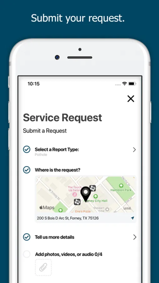 MyForney is the official mobile app for the City of Forney. This app provides a connection between the Forney community and its residents. Want to report a pothole, broken streetlight, or a city code violation? MyForney makes reporting issues around town easier than ever. This app allows you to snap a photo and then uses GPS to identify your location. The requests are then reported to the appropriate city department for response. The MyForney app also links residents and visitors to city news and other important information.