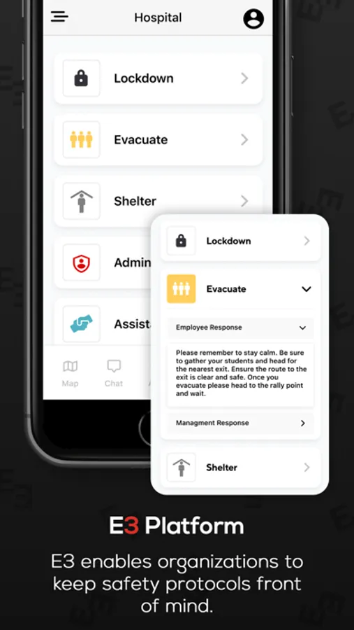 E3 allows you to manage and control any emergency at your organization. E3 connects employees, administration and first responders utilizing custom alert notifications, indoor and outdoor smart maps, electronic emergency protocols/plans and real-time chat.