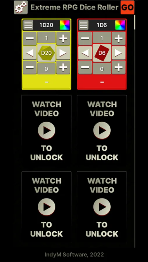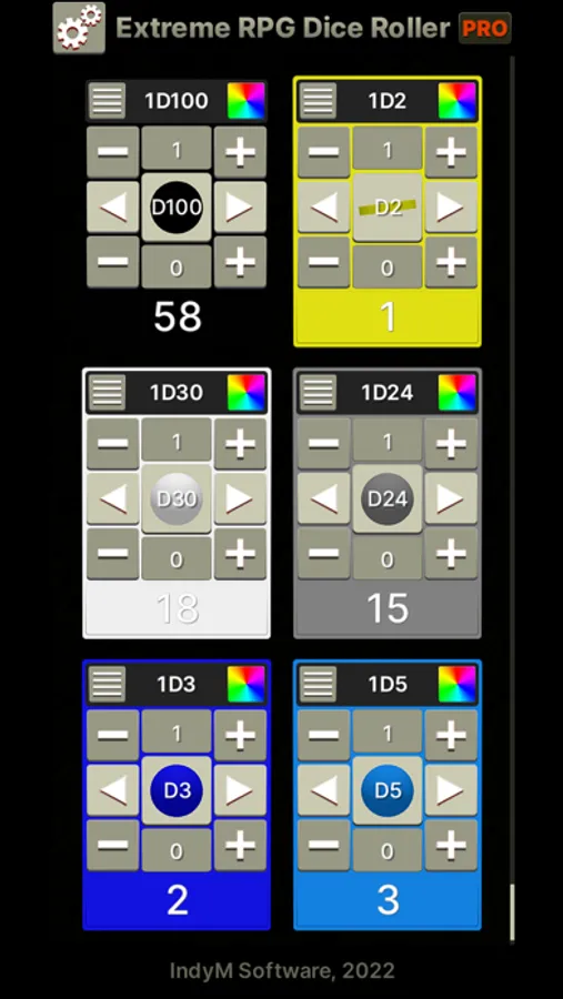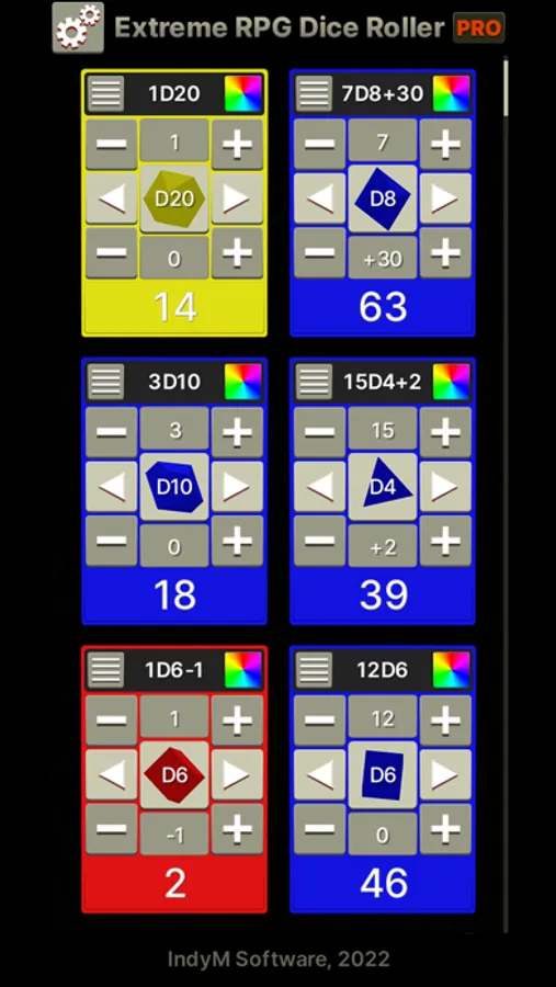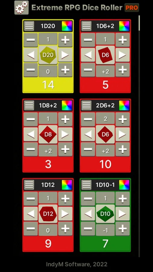 For each slot you can set how many dice to use, which type of die, a +/- modifier and its color, then just touch the die, it will spin and a result will appear on the bottom part of the slot.