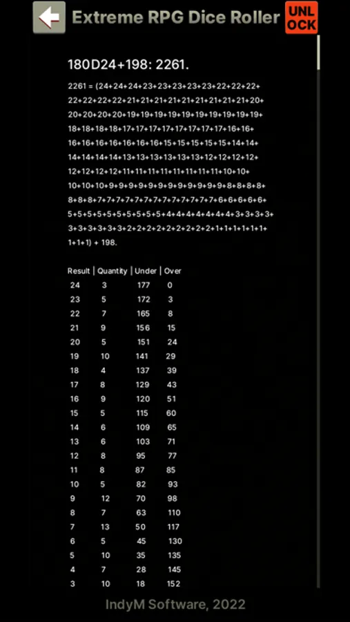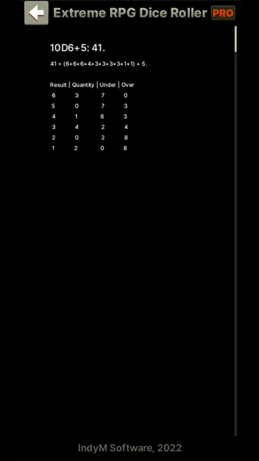 The result shown is the sum of all the dice, you can also check more detailed information on the roll by touching the button on the top-left of each slot, this will show a detailed view of the last roll like the result of each die, quantities, under and over.