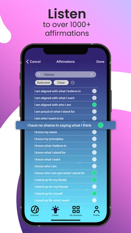 2. Affirmations - Choose what YOU want to affirm. Curate your list from our bank of 1000+ affirmations that spread across all areas of life to get the results YOU want.