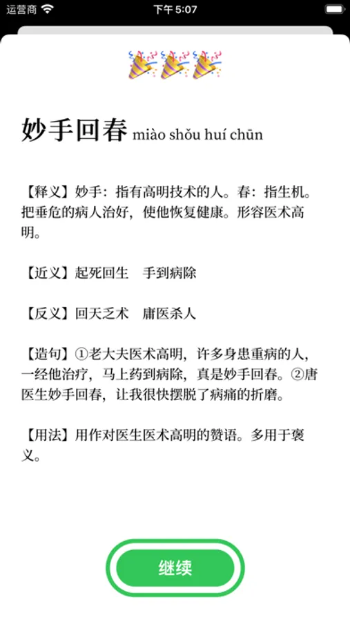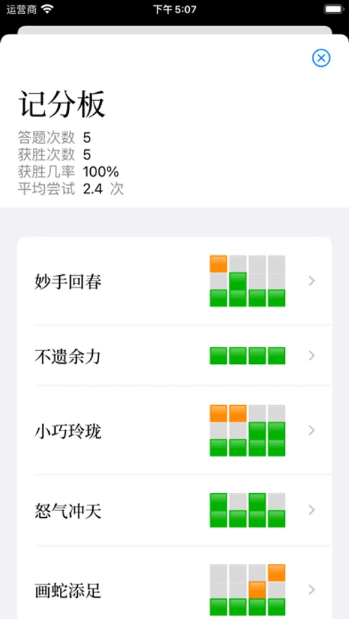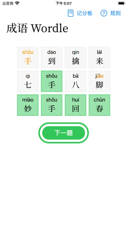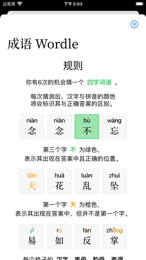 每次猜测后,汉字与拼音的颜色将会标识其与正确答案的区别。