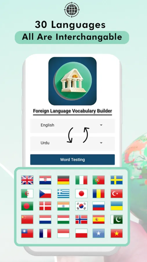 Most foreign language learning apps support learning in only a few languages, mainly English. Our vocab builder and free language learning app allows you to improve your English, but also learn languages for free in 30 languages including: