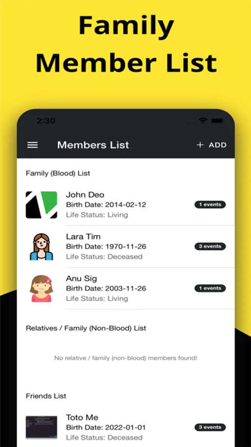 - Auto-generated family tree based on the family members list, and export it in PDF.