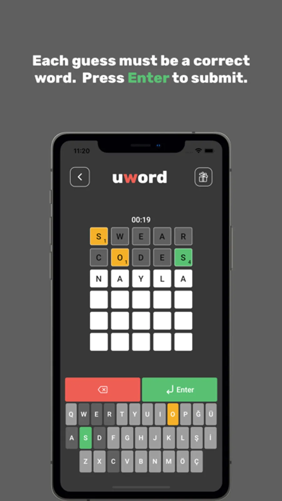 Uword is a free word puzzle where you have to guess a five-letter word in 6 tries or fewer! After each guess, the letters that are correct and misplaced are highlighted.