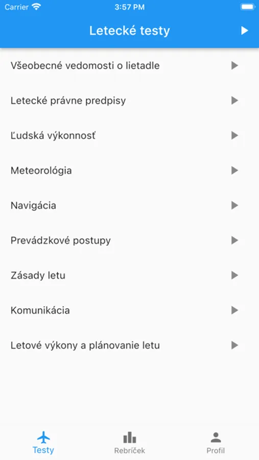 Letecké testy je prvá aplikácia pre slovenský trh, ktorá ťa vyskúša pred tým, než pôjdeš na reálne skúšky na Dopravný úrad. V aplikácii nájdeš 8 testov z rôznych oblastí, ktoré sú určené najmä pre pilotov, ktorí sú vo výcviku na typ PPL(A)/LAPL(A). Celkovo je v aplikácií 1609 otázok.