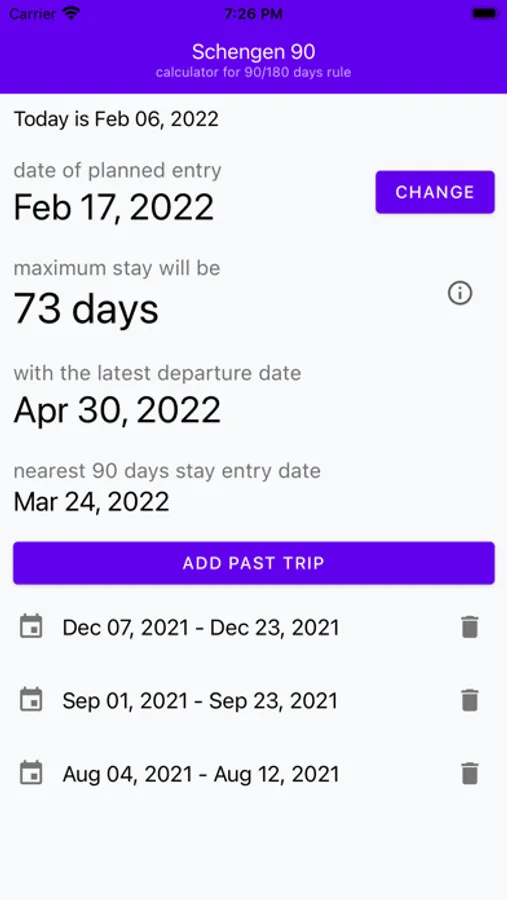 The app checks how long you can stay not violating 90/180 days rule by checking 180 days periods back from every day of your planned stay and counting days from your past trips.