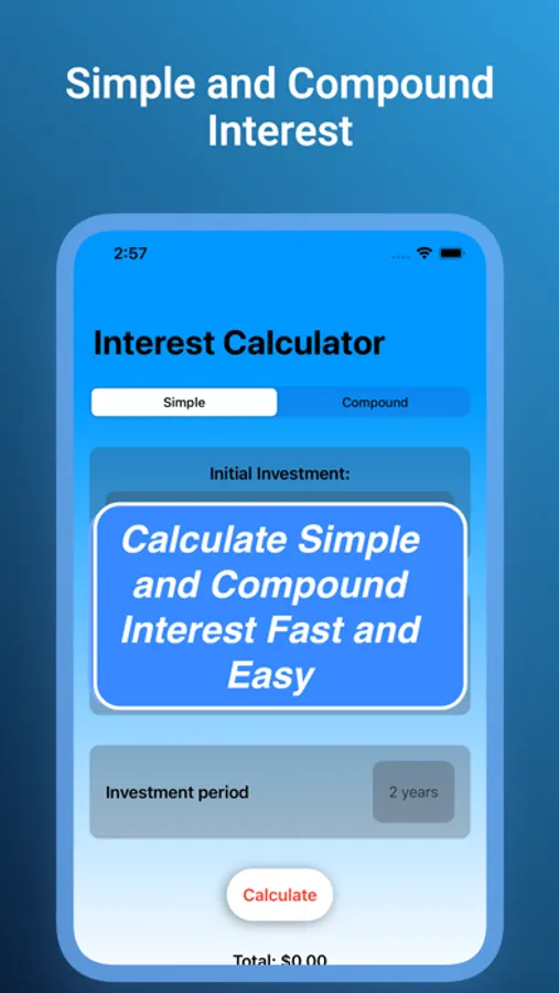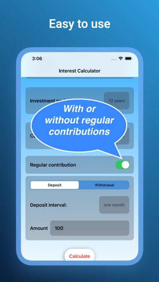 Calculate compound and simple interest in easy and simple way, you can use regular contribution button to calculate regular deposits or withdrawals, a summary with all details also available in different window. The calculation for contributions is made assuming the contributions are made at the end of each contribution interval.