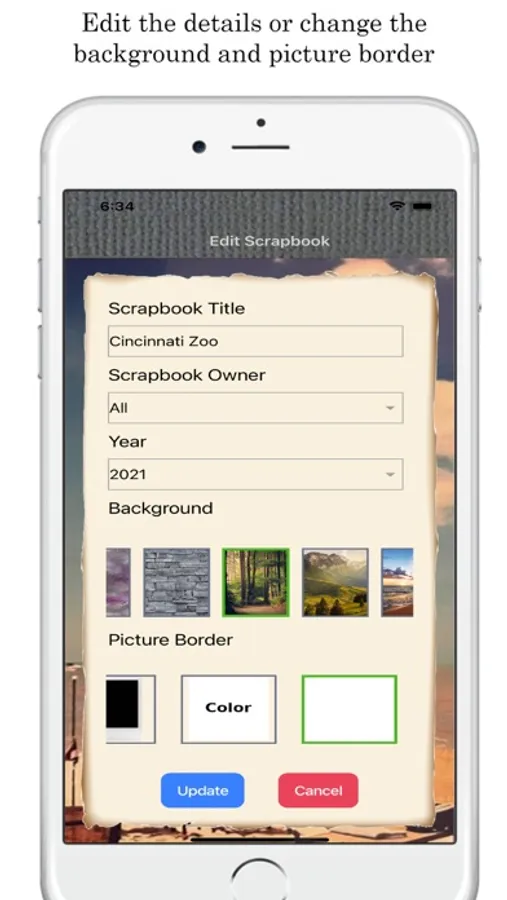 Simply add a scrapbook, fill out the title, who the scrapbook is for, the year, and then you have the option to pick a background image and picture border. You are now ready to add pictures to your scrapbook. Scrapbooks can be holidays, birthdays, sporting events, vacations or whatever memories you want to capture each year.