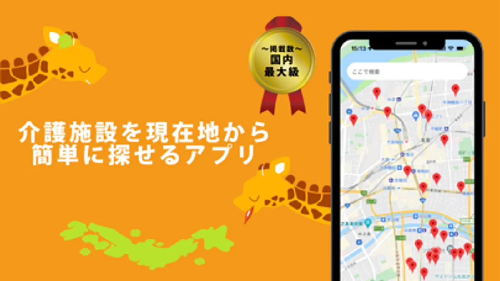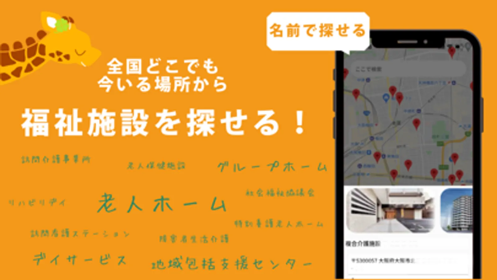 全国の介護施設を地図上で探せるアプリ。