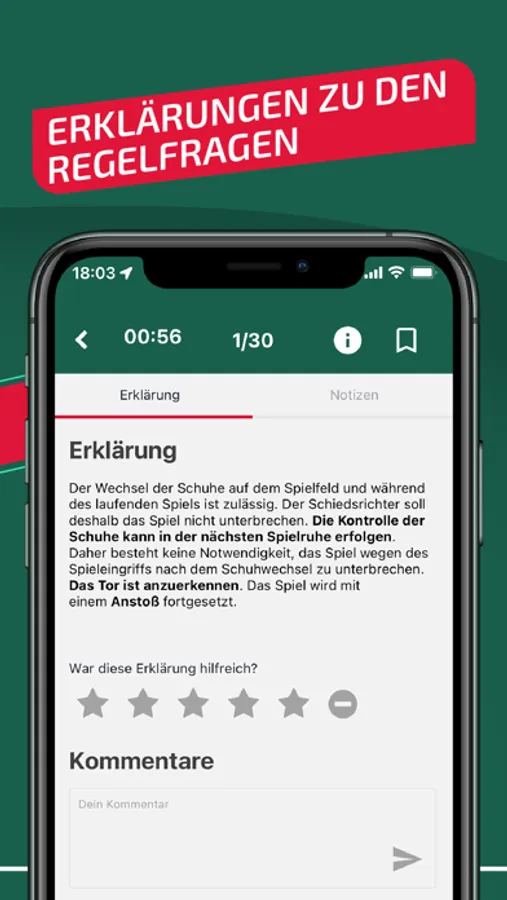 Die App bietet auch benutzerdefinierte Statistiken, die die Stärken und Schwächen des Benutzers zeigen. Diese Statistik hilft Nutzern dabei, ihr Wissen zu verbessern und ihre Fähigkeiten gezielt zu erweitern. Regelfragen werden den Benutzern auf unterhaltsame Weise beigebracht, egal ob sie begeisterte Fußballzuschauer, Fußballspieler oder angehende Schiedsrichter sind.