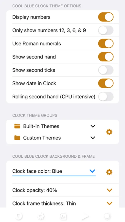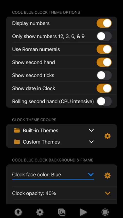 Every element of the clock face is customizable, including switching between Arabic and Roman numerals, number only on 12, 3, 6, and 9 o'clock positions, and whether to show numbers at all. In addition, you can color and adjust the opacity of the clock face background between zero to 100%, and you can also change the color and thickness of the clock frame!