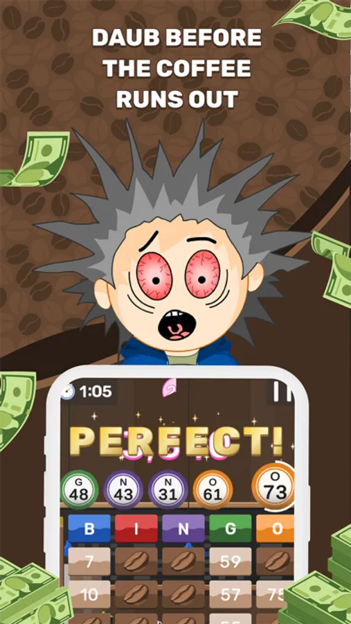 Your favorite caffeinated buddy is back in a new kind of fast-paced blackout bingo game that pays you real money! Keep the coffee flowing by daubing before his cup runs dry and he freaks out!
