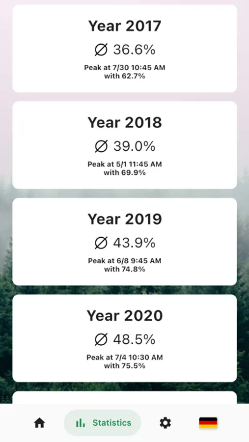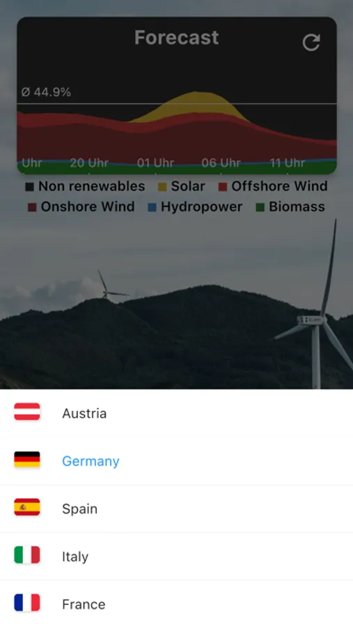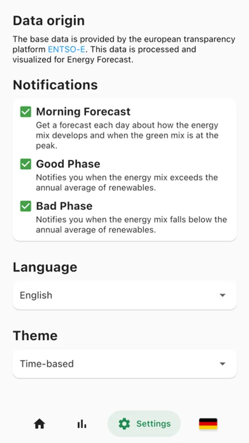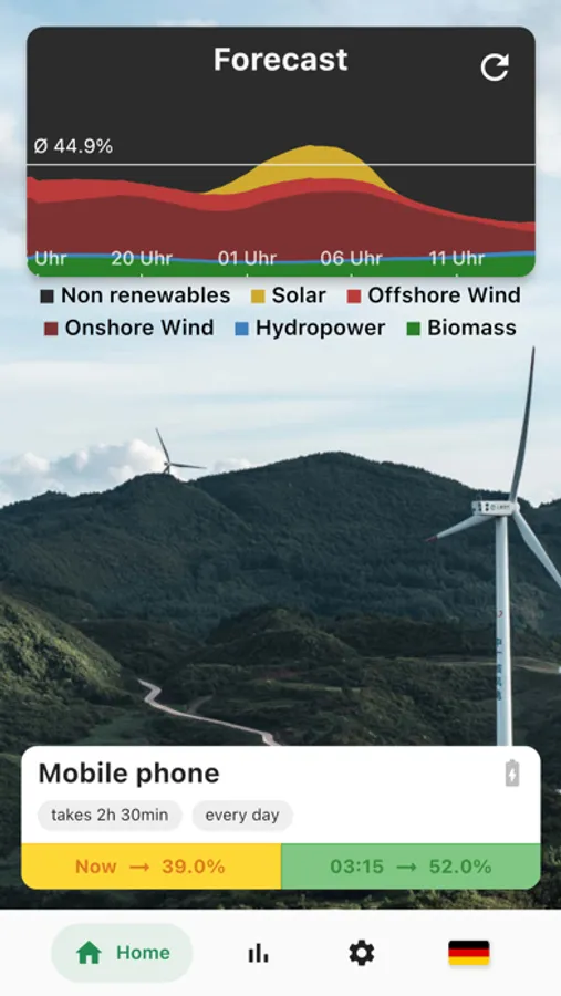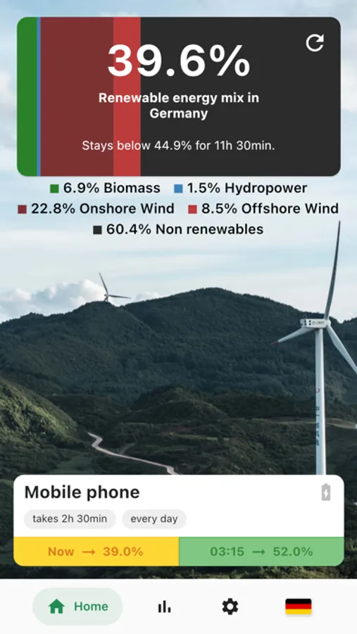 This app helps you detect when energy is renewable and helps to discover the cloudy days and nights without any wind by presenting the current percentage of renewable energy of your countries energy and how it will change in the near future with a forecast. Data for the next day arrives around 6pm.