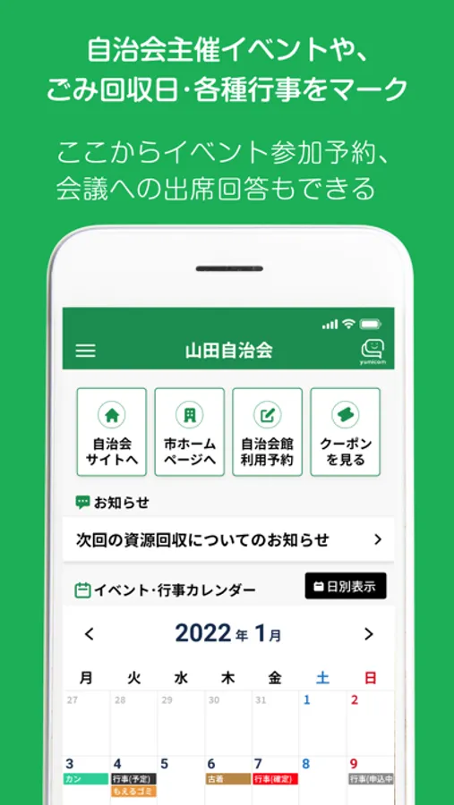 ユミコムは、自治会運営の「役員なり手不足」「高齢化問題」「IT化の遅れ」「地域コミュニケーションの希薄化」の問題を現場で変えたいと立ち上がった自治会運を実際に行う担当者が、自治会運営の諸問題を改善するために、住民間で意見を出し合い作りあげた自治会をはじめとした各種団体の活動・運営をアシストするアプリ。