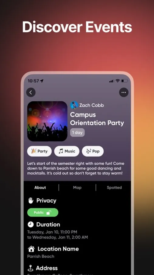 Welcome to Spotlyte! Our goal is to make your search for social events as easy as possible. Spotlyte allows you to easily see events in your area and quickly host new events for others to see. You can use the Discover and Maps screens to quickly find new events in your area. The Home Screen will display similar events, as well as the events you’ve already spotted. You can quickly create an event by clicking the large + on the icon bar and entering the event information as necessary. If you need more information about an event or you want to spot it, you can simply click on the event to see the event details page.