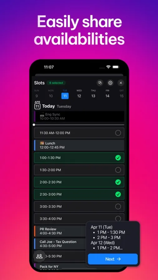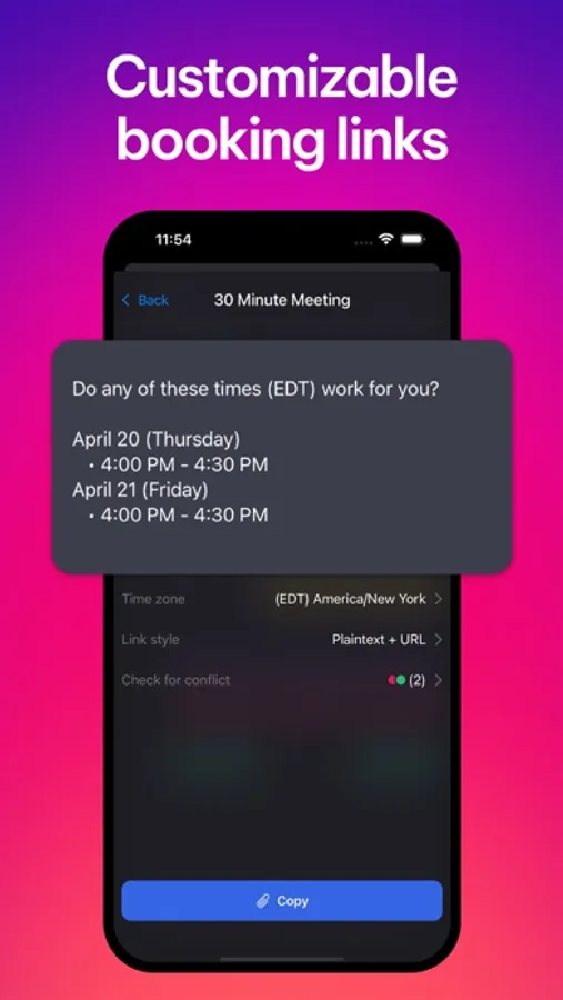 Slots — Sending a booking link feels transactional, but typing out your free times instead is tedious. Get the best of both worlds with our drag-and-copy availability feature!
