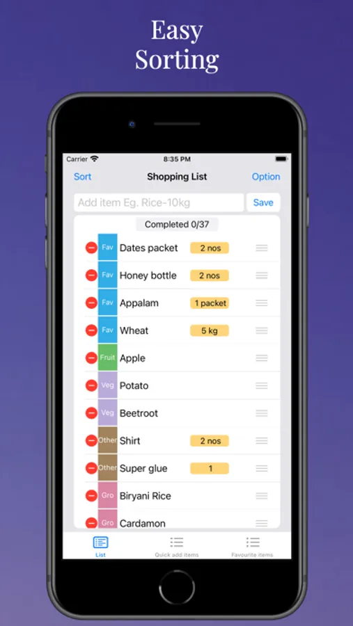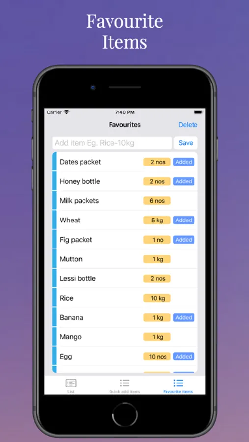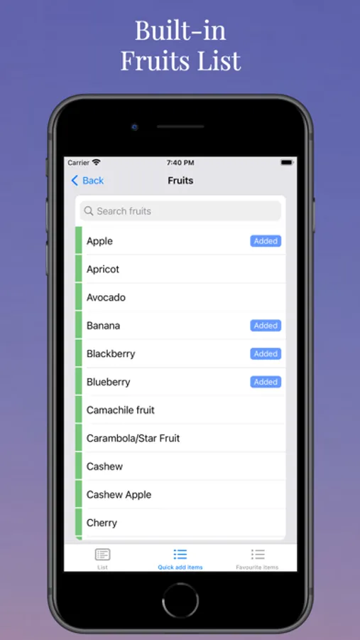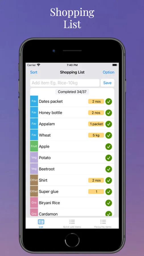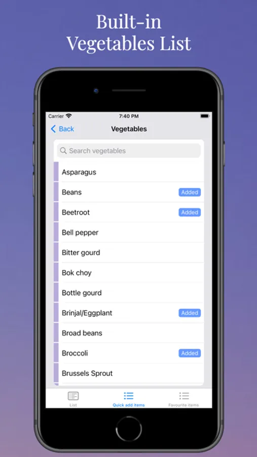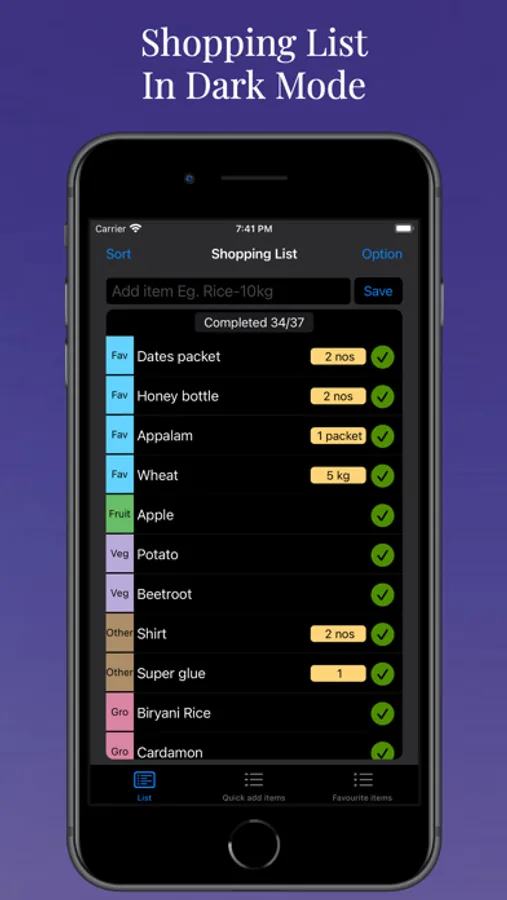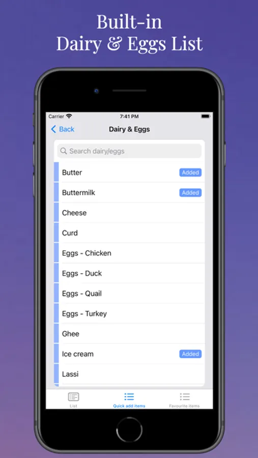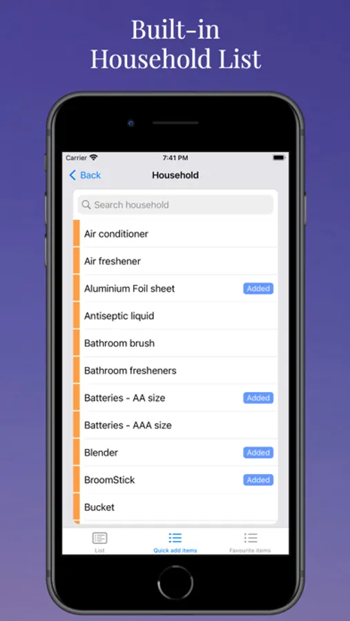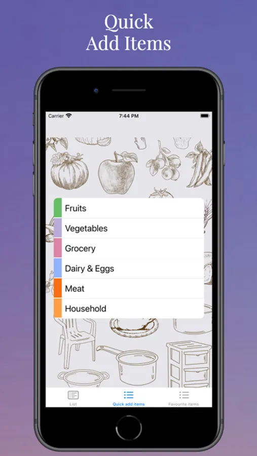 - Built-in list of Fruits, Vegetables, Grocery, Dairy, Meat and Household items are available