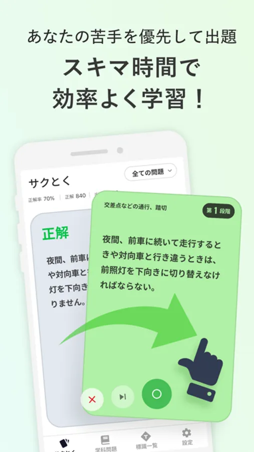 あなたの苦手な問題・解いたことのない問題を優先して出題するので、スキマ時間で効率よく学習できます。