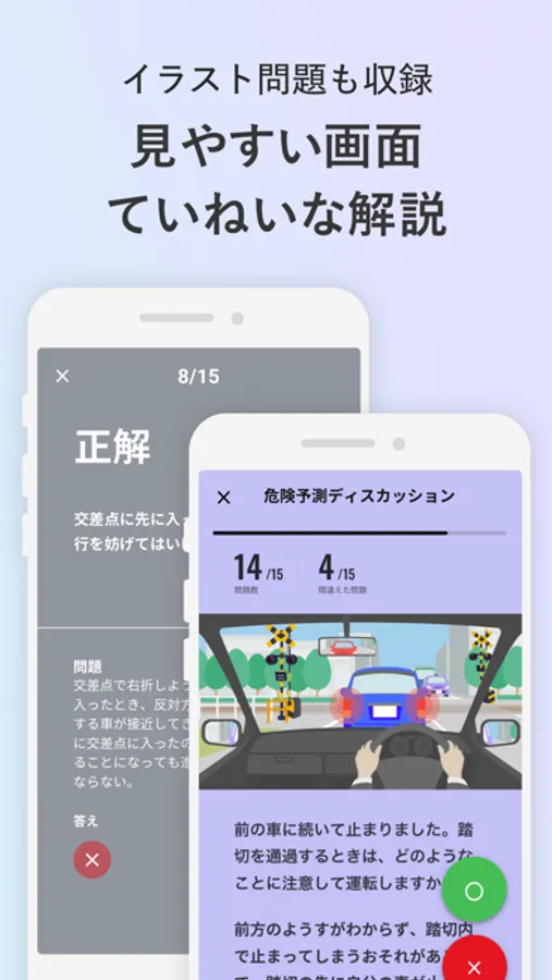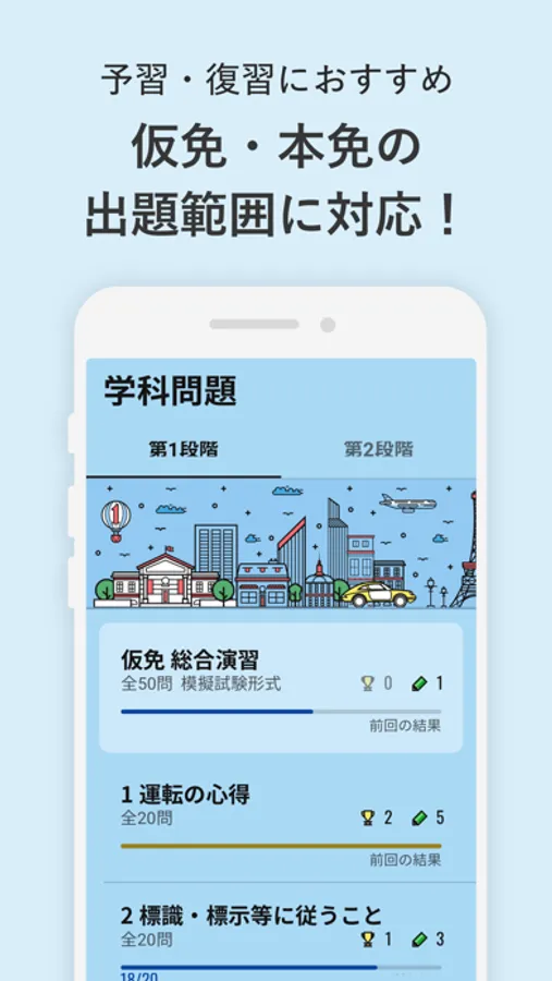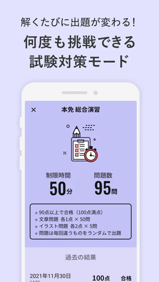 仮免・本免の学科試験を想定した演習に挑戦できます。挑戦結果の履歴も確認でき、点数が伸びたことを実感できます。
