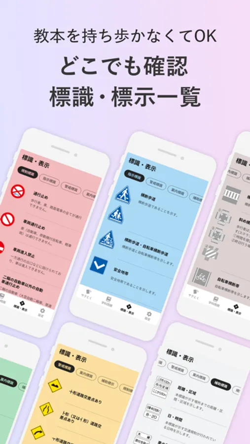 道路上の標識・標示の形や名前、意味を一覧で確認できます。アプリで確認できるので、教本のないところやほかの参考書と一緒に使えます。