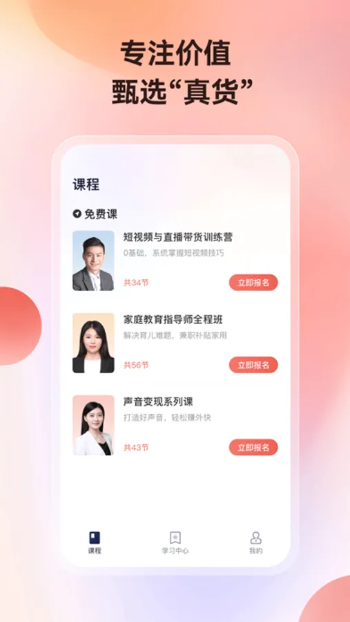 讲真汇集专业知识、把脉前沿动向,通过多种形式的课程内容,传递专业知识,为用户拓宽视野、增长见识,创造有温度的知识内容陪伴在用户的每个学习阶段,满足用户碎片化的学习需求,实现个人价值提升。