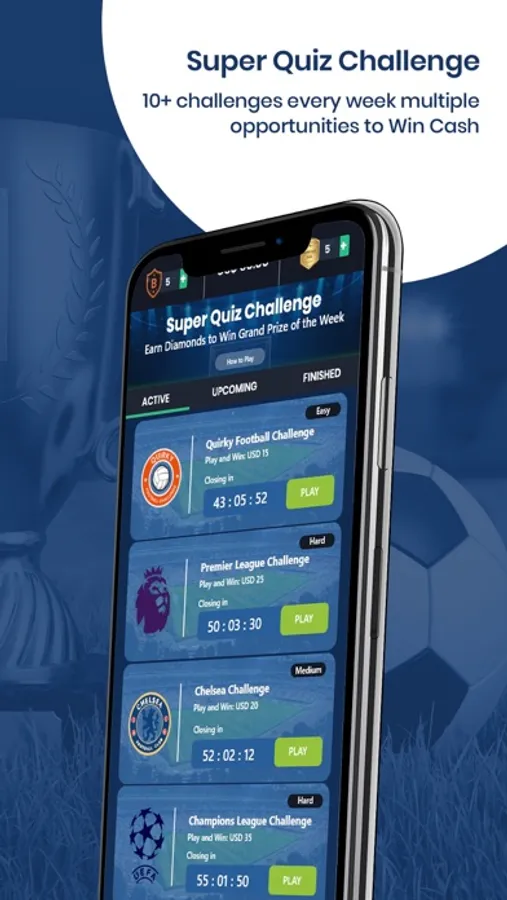 SUPER QUIZ CHALLENGE: Super Quiz Challenge is an ultimate test of your knowledge. Every week 10 plus different Quiz Games are offered related to Different Leagues, Clubs & Players. Every Quiz Game has its own Leaderboard and Prizes. So, find your Sweet Spot and Play to Win.