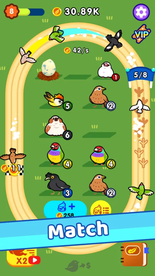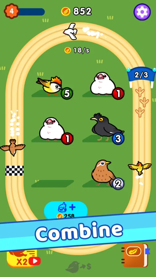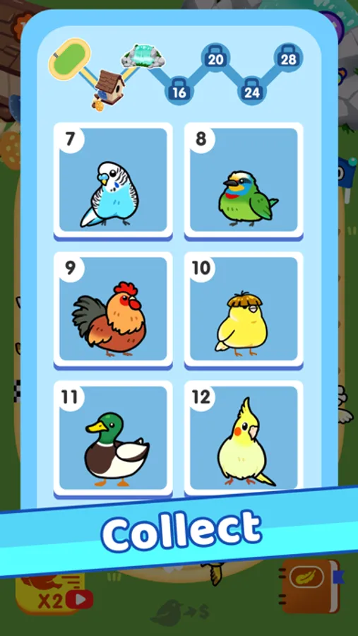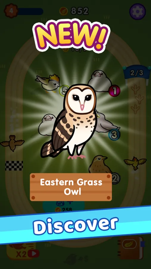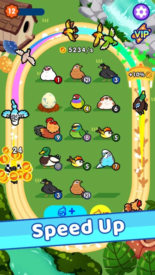 Merge your birds and combine them to upgrade. Discover species such as parakeet, macaw, cockatiel, hornbill, hummingbird, grass owl, penguin, cockatoo, mandarin duck, pheasant, canary, finch, parrot, eagle, peacock, shoebill, eagle, toucan and more.