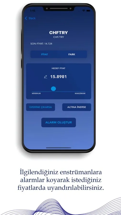 -Tüm altın fiyatları, döviz kurları, ve kripto paralar için ister değere ister değişiklik miktarına (farka) göre kurulan bildiri alarmı ile kayıtlı kullanıcılarını otomatik bilgilendirir.