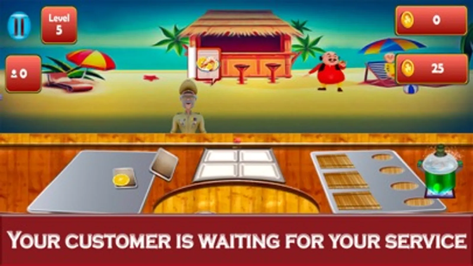 In this Motu Patlu Game - Cooking Chef Motu Patlu Games, where Motu and Patlu making foods they stand on cooking table, customer will come to cooking bar make order, take served order and go to enjoy their food. You need to take order and serve within a time limit and help Motu Patlu to run their restaurant. This is needed to complete maximum order within given time. Download Motu Patlu Cooking for free in your mobile and enjoy.