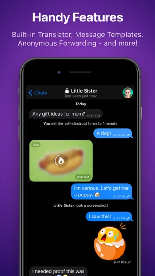 - Built-in Translator: instantly translate both incoming and outgoing messages without having to leave the chat! This unmissable feature supports all languages!