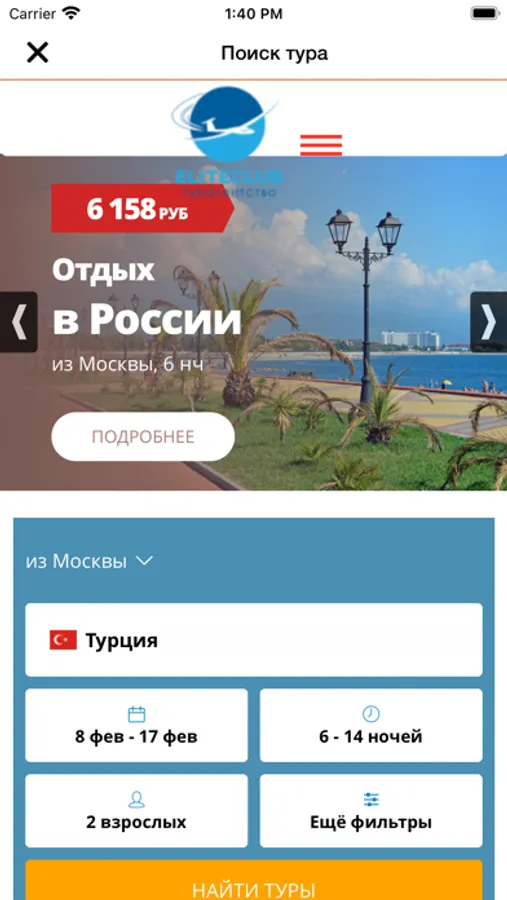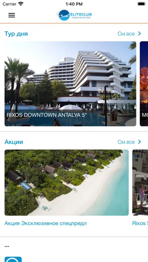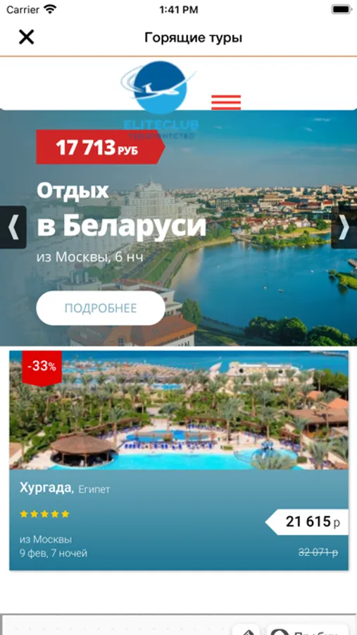 Наше приложение туристического агентства EliteClub создано для тех, кто собрался в путешествие , отпуск и ищет горящий тур на самых выгодных условиях. Все предложения от ведущих туроператоров Anextour, Coral, Pegas, Sunmar, Teztour, TUI, Intourist, Библиоглобус.