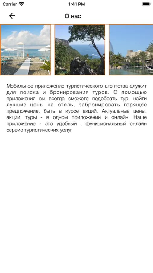 В приложении можно быстро найти тур с самыми большими скидками. Посмотреть описание и фото отелей, рейтинг отеля на основе отзывов от туристов. Если вы сомневаетесь в выбранном отеле и вам нужна консультация специалиста отправьте запрос и наши менеджеры обязательно с вами свяжутся.
