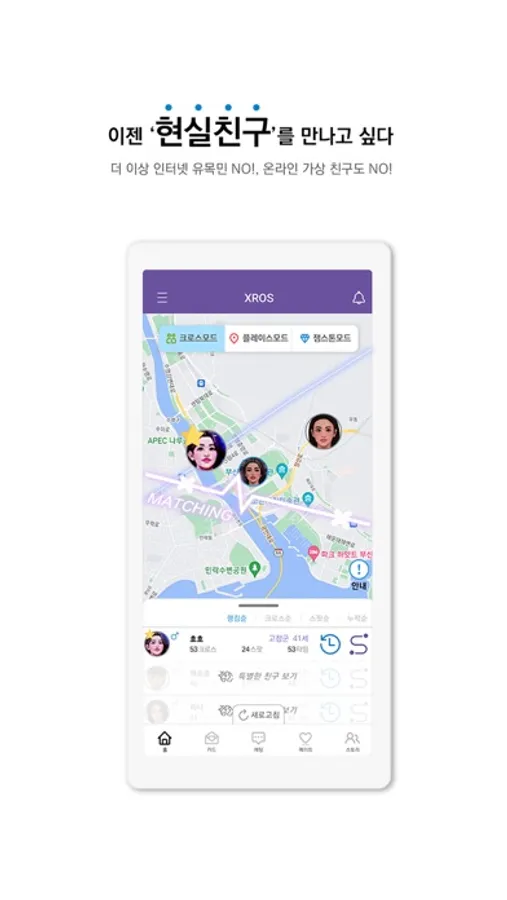 1. XROS는 오프라인 위치기반 매칭 알고리즘으로서 가상, 유령 회원은 있을 수 없어요. 오로지 현실세계의 찐 회원들만을 보여주는 진정한 리얼 ‘자만추’ 어플리케이션이예요.