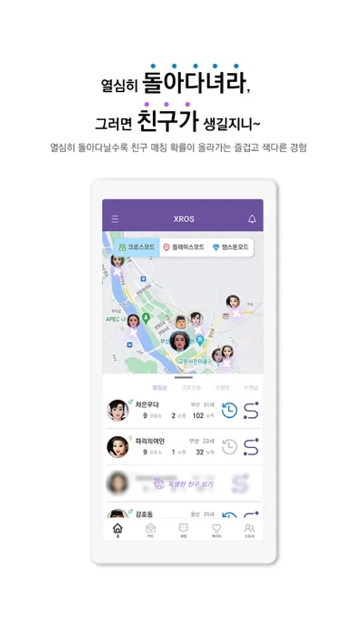 XROS는 오프라인 위치기반의 라이프패턴이 꼭 맞는 여행친구, 일상친구, 맛집친구, 찐친구을 찾아주는 신기하고 새로운 리얼 자만추 앱이예요.
