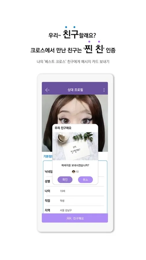 ‘친구해요’ 카드를 수락하면 친구의 상세 프로필 보기와 친구와의 대화도 가능하답니다.
